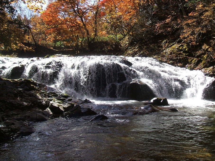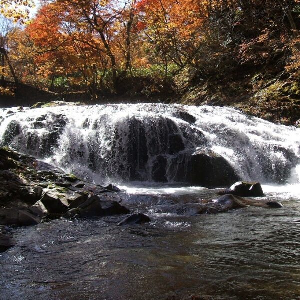 落差は約3mと控えめですが、川幅いっぱいに流れ落ちる姿は美しく、周辺の木が色づく秋の紅葉時季が特におすすめ。滝が凍結する冬も神秘的ですが、積雪や凍結するためアイゼン・ピッケルなど、登山装備がないと危険です。