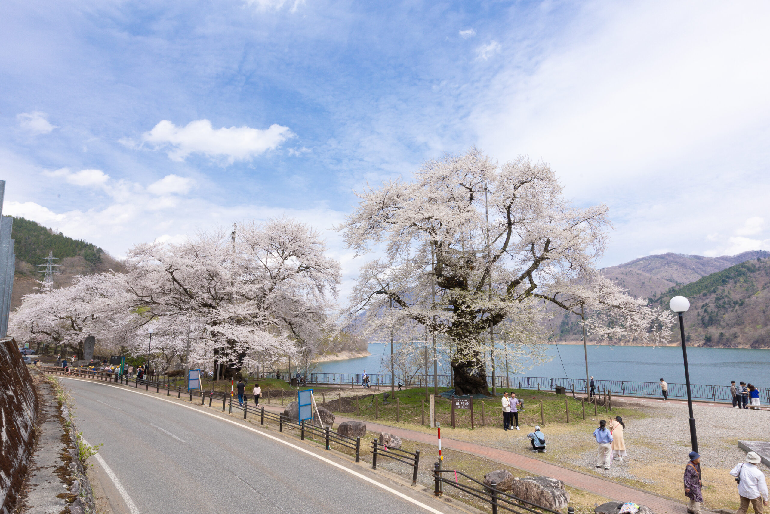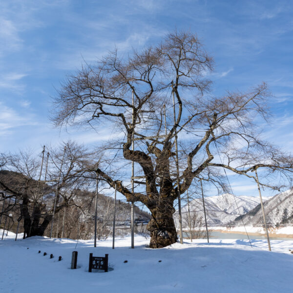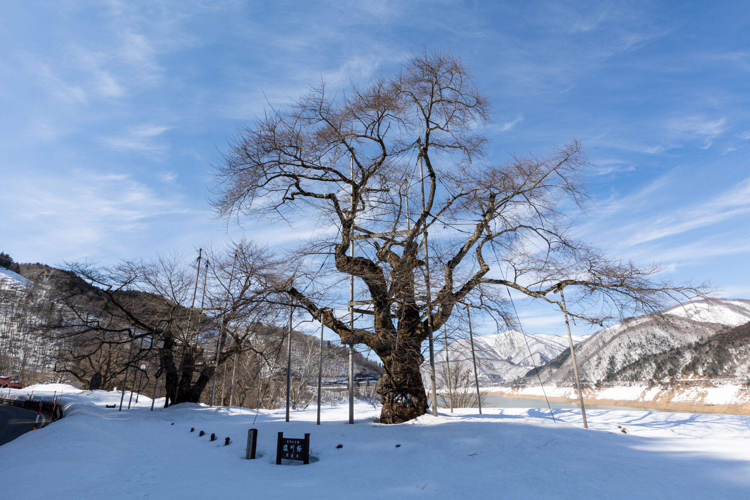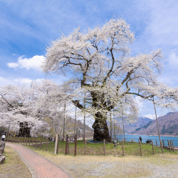 御母衣湖畔の展望台に佇む、樹齢500年余年のアズマヒガンザクラ。かつて照蓮寺と光輪寺の境内にそれぞれ根付いていた巨木は、御母衣ダム建設の際に湖底に沈むのを惜しんで移植され、現在も春になると美しく花を咲かせています。