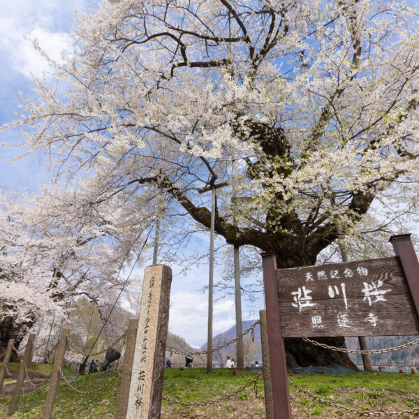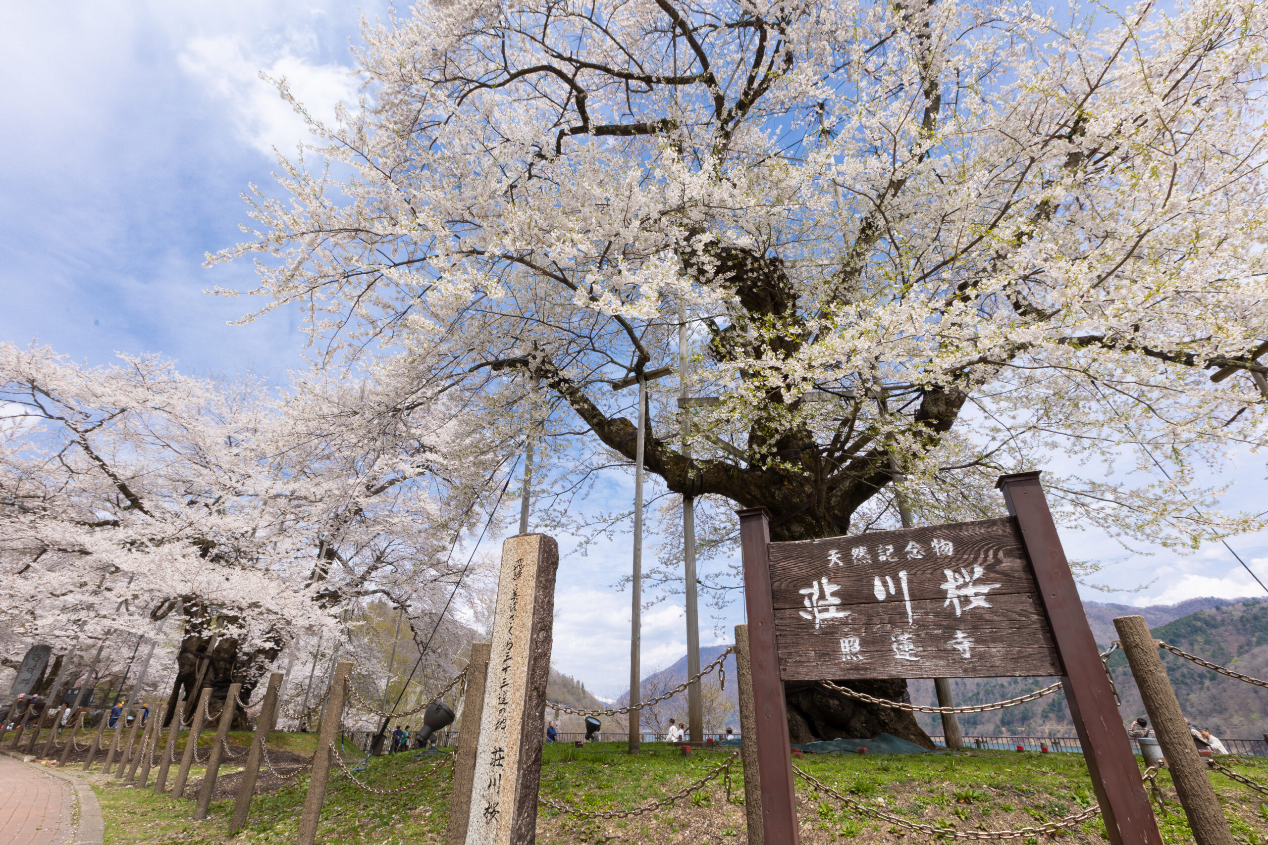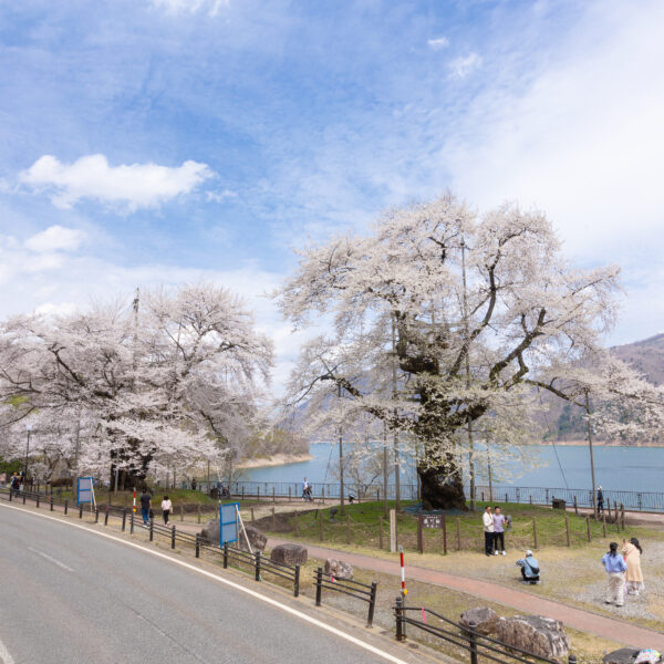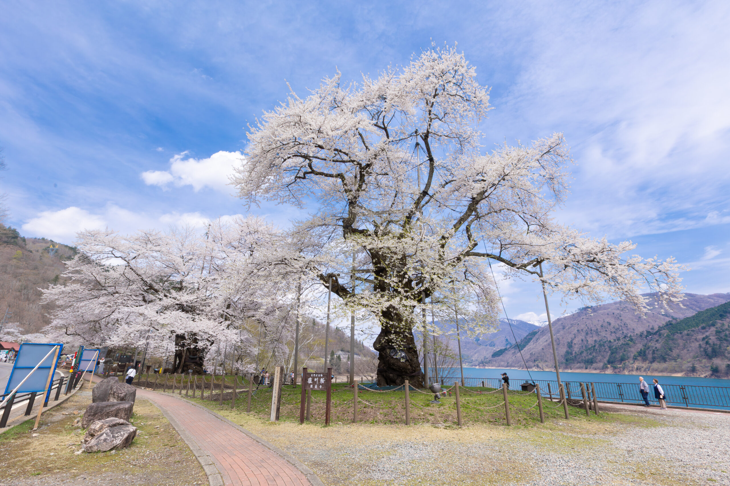 御母衣湖畔の展望台に佇む、樹齢500年余年のアズマヒガンザクラ。かつて照蓮寺と光輪寺の境内にそれぞれ根付いていた巨木は、御母衣ダム建設の際に湖底に沈むのを惜しんで移植され、現在も春になると美しく花を咲かせています。